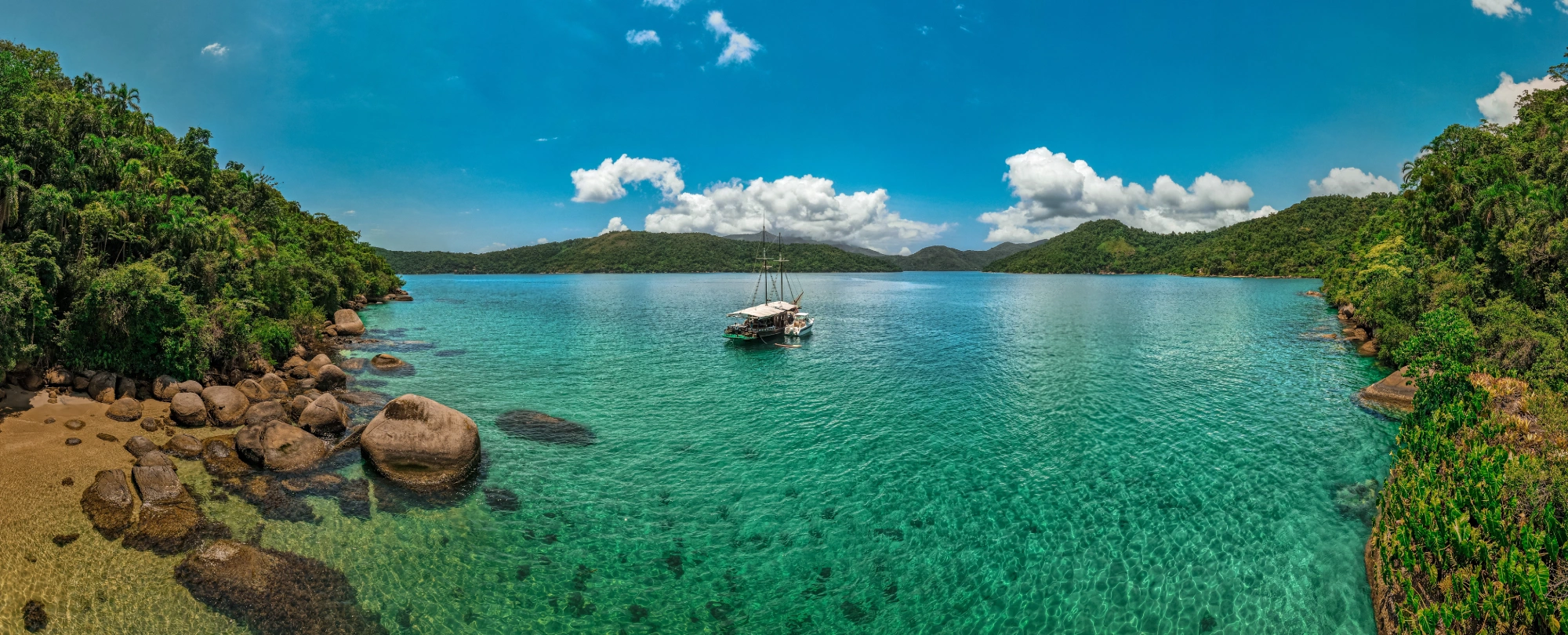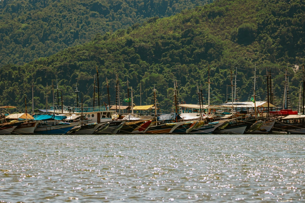 A Baía de Paraty convida a navegar por águas calmas que refletem o céu, a mata e a história viva da cidade.