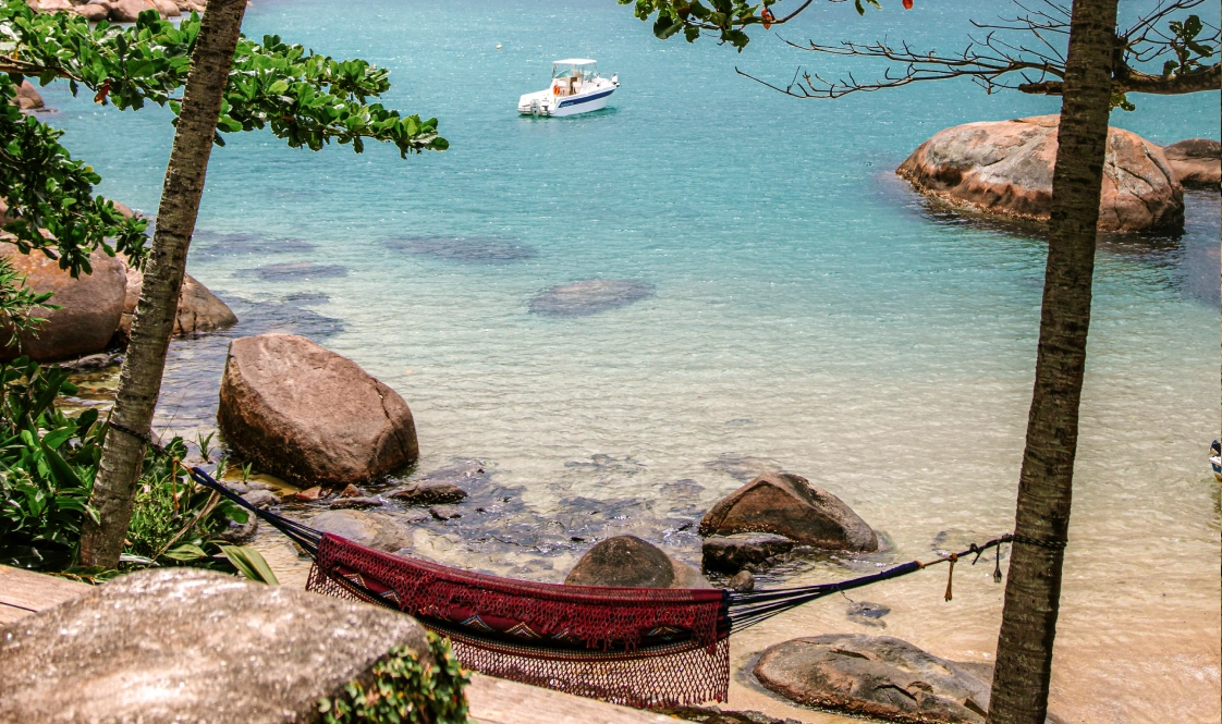 Praia reservada com apenas uma casa charmosa para aproveitar os dias com o som do mar, experimentar frutos do mar frescos com sabores de Paraty, estar cercado pela natureza exuberante da Mata Atlântica e balançar na rede.