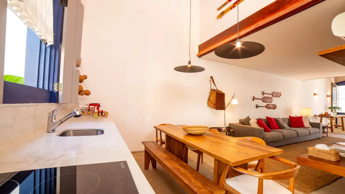 Pequena casa colonial de 120 m², reformada e integrada ao casario principal. A fachada é para a rua, mas para maior privacidade, o acesso se faz pela entrada principal da pousada. São dois andares. No primeiro, sala de estar com sofá, poltrona e uma minibiblioteca convidativa para uma tarde mais reservada, cozinha e mesa de jantar de seis lugares. No segundo andar, uma suíte ampla e charmosa, e um banheiro conta com um chuveiro delicioso.