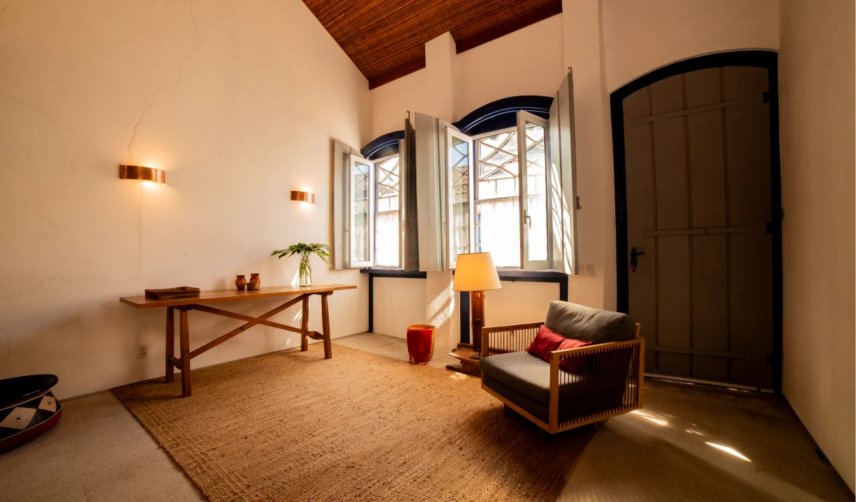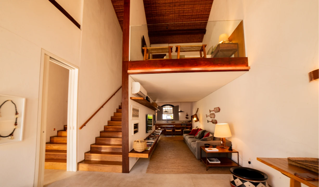 Pequena casa colonial de 180 m², reformada e integrada ao casario principal. A fachada é para a rua, mas para maior privacidade, o acesso se faz pela entrada principal da pousada. São dois andares. No primeiro, sala de estar com sofá, poltrona e uma minibiblioteca convidativa para uma tarde mais reservada, cozinha e mesa de jantar de seis lugares. No segundo andar, uma suíte ampla e charmosa, e um banheiro conta com um chuveiro delicioso.