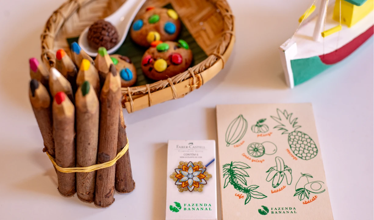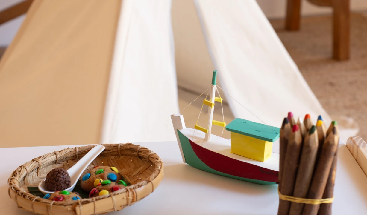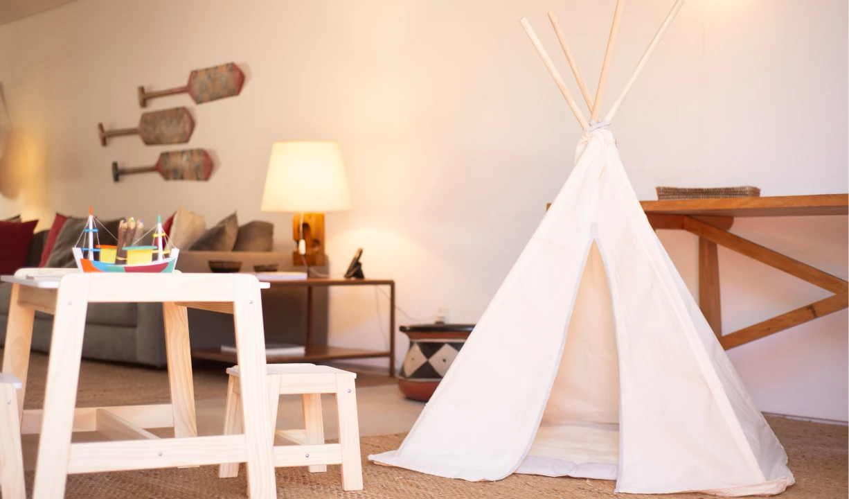 Sempre há um espaço arrumado nas acomodações para eles se divertirem - cabanas, mesas com lápis e papel, e livros infantis sob curadoria da charmosa Livraria das Marés.